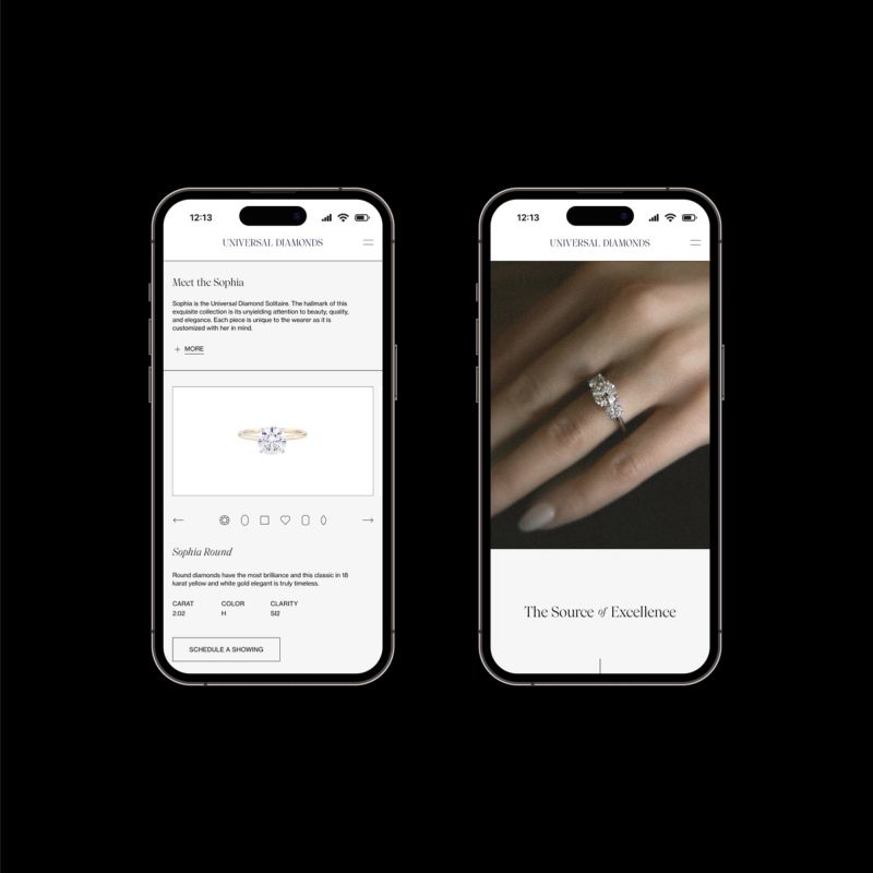 Universal Diamonds is where timeless romance meets modern elegance. We created branding that speaks to high-end customers with clarity and sophistication, using sleek infographics to make the buying process approachable. The website pairs refined typography with dreamy, nostalgic photography and a romantic color palette, bridging the gap between classic luxury and contemporary style.